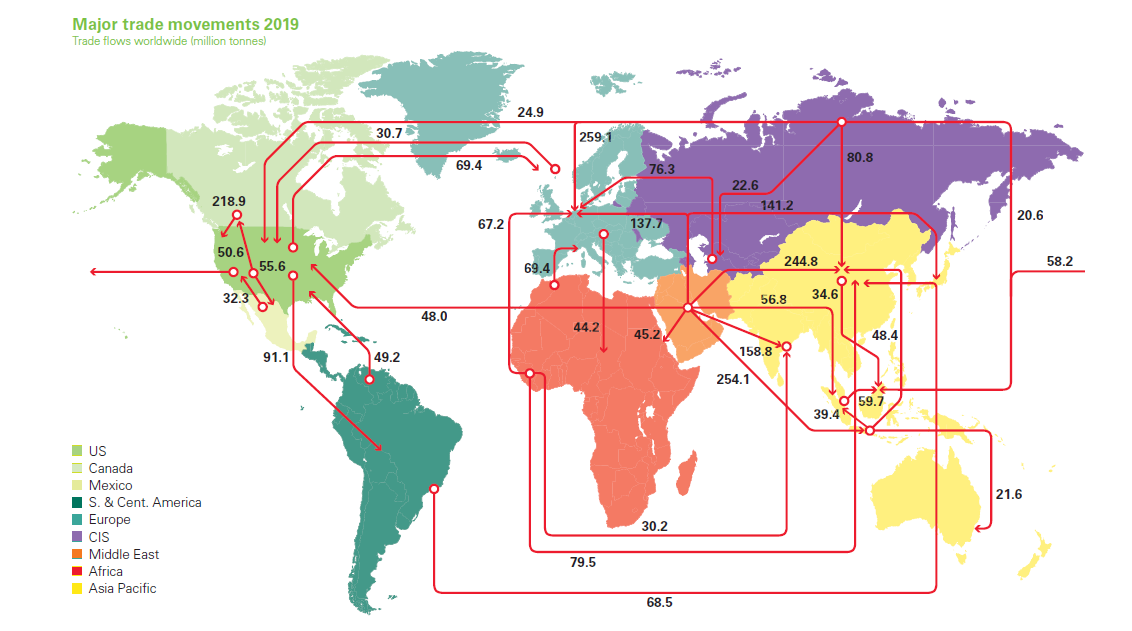 اصلی ترین مسیرهای داد و ستد نفت در سال 2019 در دنیا بر اساس میلیون تن