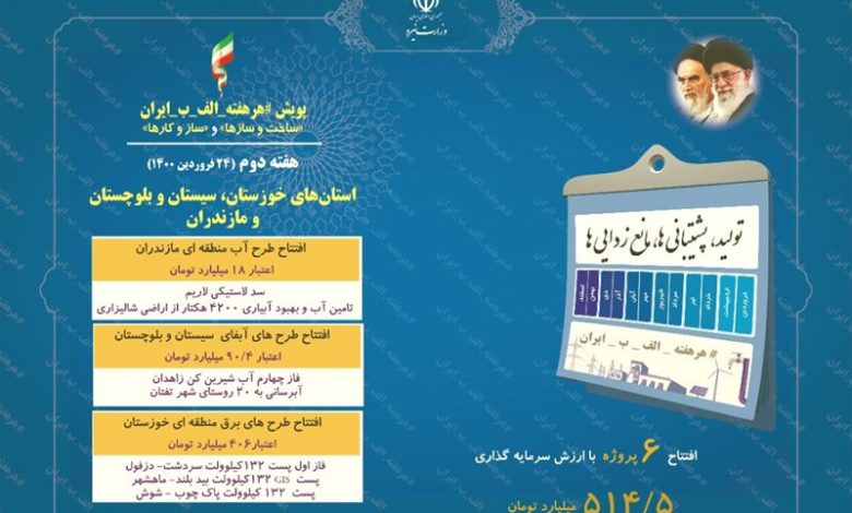 6 پروژه صنعت آب و برق به ارزش 514.5 میلیارد تومان در استانهای خوزستان، سیستان و بلوچستان و مازندران، با حضور ویدئو کنفرانسی وزیر نیرو و در قالب دومین هفته پویش #هرهفته_الف_ب_ایران در سال 1400 افتتاح شد.