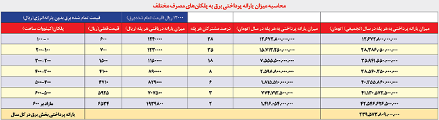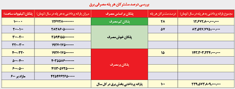 بر این اساس از حدود 239 هزار میلیارد تومان یارانه پرداختی به بخش برق 143 هزار میلیارد تومان آن مربوط به پلکان پرمصرف است این یعنی 60 درصد یارانه پرداختی برق به ۱۵ درصد جمعیت پرمصرف کشور میرسد.با همه این مسائل اما اصلاح یارانههای انرژی، خود نیز مساله بسیار مهمی است که شیوه و نحوه این اصلاحات و برنامهریزیها برای این اصلاحات، نیاز به بررسیهای بسیار زیادی دارد. همه این آمار و ارقام نشان از این دارد که یارانههای انرژی عادلانه بین مردم تخصیص نمییابد، ولی موضوع مهم در این بین، عدم تعرض به مشترکان حاضر در الگوی بهینه مصرف است. با توجه به لزوم اصلاح وضعیت فعلی یارانهها و حرکت به سمت عادلانه شدن یارانههای پنهان، بهترین مسیر، اصلاح قیمت پلکانهای پرمصرف گاز و برق توسط وزارتخانههای نفت و نیرو است به نحوی که مصارف بالاتر از الگوی مصرف هیچ یارانهای دریافت نکند. به عنوان مثال در وضعیت فعلی صنعت برق برای محاسبه قیمت تمامشده، قیمت تولید برق حدود 675 تومان است و طبق پژوهشهای مرکز پژوهشهای مجلس هزینه توزیع برق نیز حداقل به میزان هزینه تولید برق است و با احتساب اینها، قیمت تمامشده برق حدود 1300 تومان است اما در وضعیت فعلی پلکان آخر نیز حداکثر به 800 تومان میرسد و این خود عمق فاجعه یارانههای انرژی در بخش برق و مشترکان پرمصرف را نشان میدهد. در جداول موجود میزان مصرف افراد و پلکانهای مختلف و میزان یارانه هر مشترک مشخص شده است.