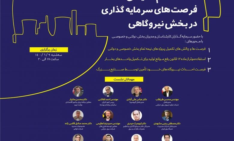 نشست هماندیشی فرصتهای سرمایهگذاری در بخش نیروگاهی با هدف تسهیل و رفع موانع تولید نیروی برق و تحقق برنامه احداث 20 هزار مگاوات ظرفیت نیروگاهی در دولت سیزدهم نهم شهریورماه توسط شرکت برق حرارتی برگزار میشود.