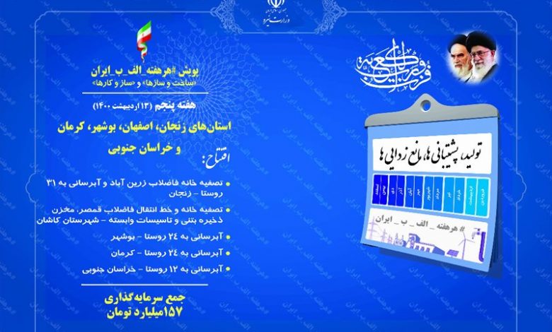 هفت پروژه بزرگ صنعت آب با سرمایهگذاری 157 میلیارد تومان در استانهای زنجان، اصفهان، بوشهر، کرمان و خراسان جنوبی فردا با حضور وزیر نیرو در قالب هفته پنجم پویش #هرهفته_الف_ب_ایران در سال ۱۴۰۰ به بهرهبرداری میرسد.