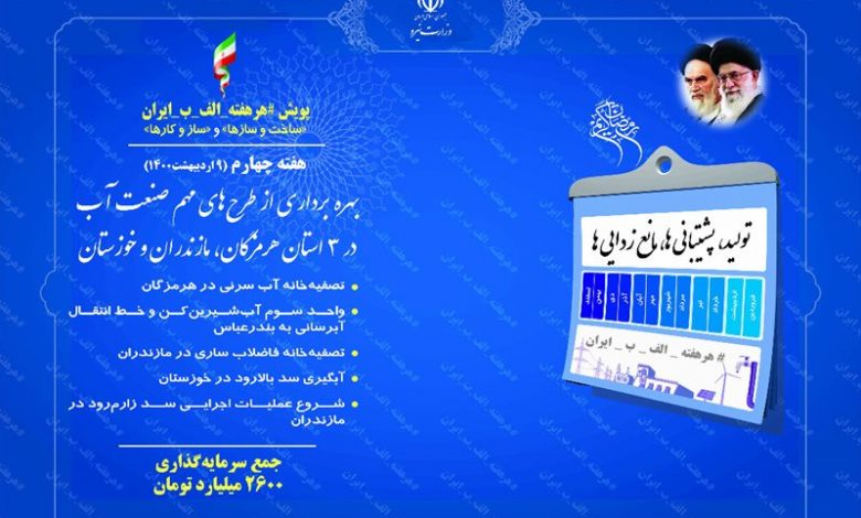 چهار طرح بزرگ صنعت آب با سرمایهگذاری 2600 میلیارد تومان و آغاز عملیات اجرایی سد زارمرود در سه استان هرمزگان، مازندران و خوزستان با حضور ویدئوکنفرانسی رئیس جمهور و وزیر نیرو در چهارمین هفته پویش #هرهفته_الف_ب_ایران در سال 1400 به بهرهبرداری میرسد.