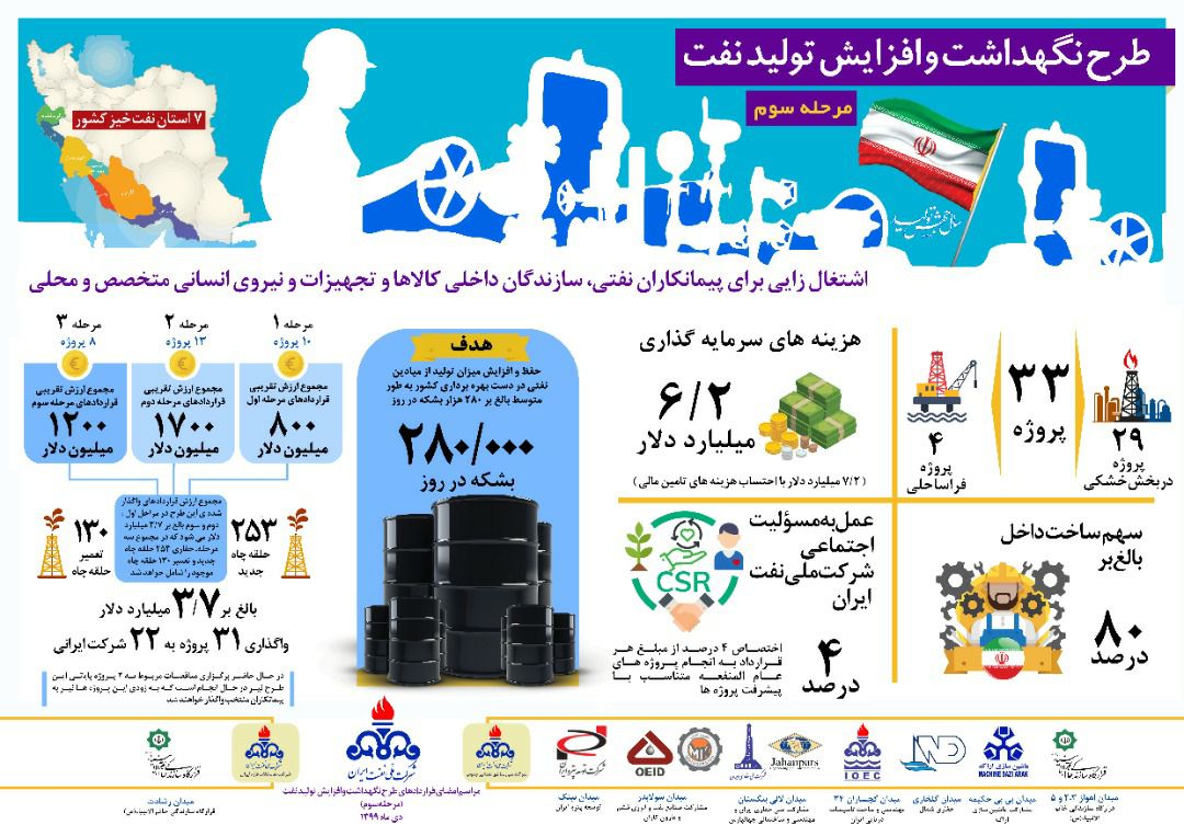 بر اساس این گزارش، همزمان با پیگیری انعقاد قراردادهای توسعه میادین نفت و گاز کشور در قالب مدل جدید قراردادهای بالادستی (IPC)، طرح نگهداشت و افزایش تولید نفت نیز با هدف ایجاد اشتغال برای پیمانکاران و سازندگان داخلی و نیز حفظ و افزایش میزان تولید از میادین نفتی دردست بهرهبرداری كشور در دستور كار وزارت نفت و شرکت ملی نفت ایران قرار گرفت. این طرح مشتمل بر ۳۳ پروژه، شامل ۲۹ پروژه در بخش خشكی و ۴ پروژه فراساحلی میشود. مجموع هزینههای سرمایهگذاری پیشبینی شده در این طرح معادل ۶.۲ میلیارد دلار بوده و با احتساب هزینههای تأمین مالی، ارقام بازپرداخت در تعهد دولت به ۷.۲ میلیارد دلار بالغ خواهد شد. پروژههای این طرح در محدوده جغرافیایی ۷ استان نفتخیز كشور كرمانشاه، ایلام، خوزستان، كهگیلویه و بویر احمد، بوشهر، فارس و هرمزگان اجرا میشوند كه پیش بینی میشود با اجرای آنها تولید نفتخام كشور به طور متوسط بالغ بر ۲۸۰ هزار بشكه در روز افزایش یابد.