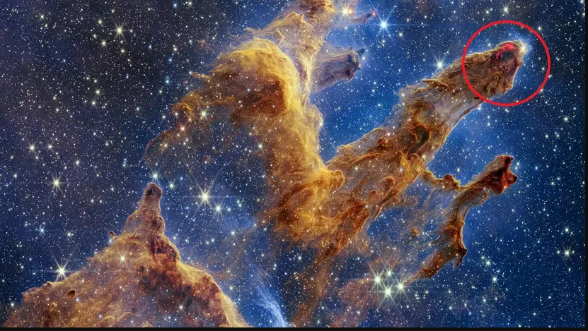 در این تصاویر که با دوربینهای فروسرخ تلسکوب جیمز وب گرفته شدهاند، ستارههای تازه متولد جلب نظر میکنند. این ستارهها به صورت گویهای قرمز روشن و عموما همراه با سنبلههای پراش (Diffraction Spikes) هستند که در روی سطح بیرونی یکی از ستونهای غبار به وضوح دیده میشوند. وقتی تودههایی از میان ستونهای گاز و غبار به جرم کافی میرسند، تحت نیروی گرانش خود شروع به فروپاشی میکنند. آنها به آرامی گرم شده و در نهایت ستارههای جدید را تشکیل میدهند.