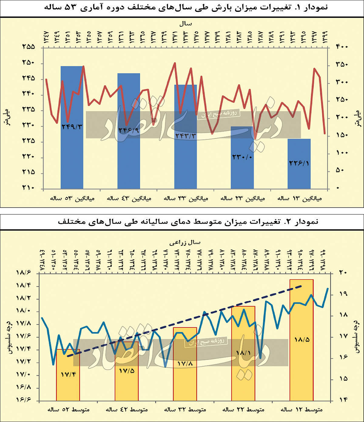 افزایش همزمان مصرف تا پیش از این با برداشت از آب‌‌‌های زیرزمینی حمایت می‌‌‌شد؛ اما کاهش بارش و افزایش تبخیر موجب شده است تا روان‌آب‌‌‌های بسیار کمی وارد سفره‌‌‌های زیرزمینی شوند و منابعی برای پوشش اضافه مصرف کنونی باقی نماند؛ موضوعی که ضرورت بازبینی مدیریت آب را از هر زمانی جدی‌‌‌تر ساخته است. به نظر می‌رسد مهم‌ترین متر آبی سیاستگذار در طول دو دهه آینده باید این باشد که اقتصاد ایران در طول 20سال آینده به شکلی تنظیم شود که با افت مصرف سرانه 300مترمکعبی آب کنار بیاید و اصطلاحا با خشکسالی سازگار شود. رشد بهره‌‌‌وری کشور در زمینه مصرف آب در این مسیر حیاتی است. از آنجا که آمار بارش‌‌‌های امسال در 21استان کشور نسبت به میانگین درازمدت به طور میانگین بین 3 تا 72‌درصد کاهش را تجربه کرده، اتخاذ تدابیری ناظر به وضعیت متفاوت هر یک از استان‌‌‌ها که اندازه خشکیدگی آنها متفاوت است، حیاتی به نظر می‌‌‌رسد. بررسی این نهاد پژوهشی از وضعیت دما و بارش در طول پنج‌بازه زمانی مختلف طی بیش از نیم‌قرن نشان می‌دهد که پایداری کشور در زمینه آب پیوسته کاهش بوده و از آن سو خطر کم‌‌‌‌آبی لحظه به لحظه جدی‌‌‌تر شده است.