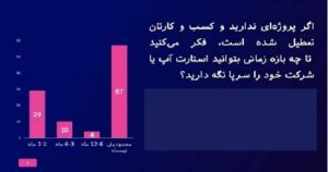در این گزارش سوالی با این مضمون مطرح شد که “اگر شرکتی پروژهای ندارد و کسب و کارشان تعطیل شده باشد، تا چه بازه زمانی میتواند استارتاپ یا شرکت خود را سرپا نگه دارد؟ نتیجه پاسخ این بود: ۲۹ درصد شرکتهای حوزه بالا دستی و سازندگان زیر سیستمها به دلیل قطع شدن ارتباطات بینالمللی و عدم استفاده از محیط کارگاهی بهزودی و بدون کمک مالی دولت شروع به تعدیل نیرو و بستن شرکتها خواهند کرد.