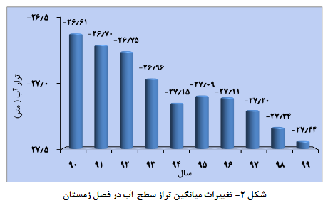 کمترین تراز آب لحظه‌ای در این فصل برابر منفی ۲۷.۶ متر و بالاترین تراز آب لحظه‌ای برابر منفی ۲۷.۰۳ متر بوده که به ترتیب در نیمه اول آذرماه و نیمه اول مهرماه مشاهده شده‌اند. دامنه نوسانی تراز آب پاییز برابر حدود پنج سانتی‌متر است. در فصل زمستان ۱۳۹۹، میانگین تراز سطح آب با کاهش هفت سانتی‌متری نسبت به فصل پاییز، برابر منفی ۲۷.۴۴ متر بوده و در مقایسه با مدت مشابه سال گذشته ۱۰ سانتی‌متر کاهش یافته، کمترین و بیشترین تراز آب لحظه‌ای مشاهده شده در این فصل برابر منفی ۲۷.۸۸ و منفی ۲۷.۱ متر بوده و به ترتیب در نیمه دوم دی‌ماه و نیمه دوم اسفندماه رخ داده است. دامنه نوسان تراز آب در این فصل بسیار کم و حدود دو سانتی‌متر تخمین زده می شود.