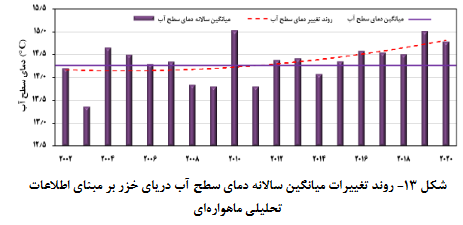 تبخیر از سطح دریا، مولفه اصلی خروجی در معادلات و تحلیل بیلان آب دریای خزر محسوب می‌شود، از معیارهای مهم در برآورد میزان تبخیر، مقدار دمای سطح آب است، براساس نتایج تحلیل داده‌های ماهواره‌ایو نیز بررسی داده‌های ثبت شده در ایستگاه‌های اندازه‌گیری ساحلی دمای سطح آب دریای خزر از روند کلی افزایشی در سال‌های اخیر برخوردار بوده است.