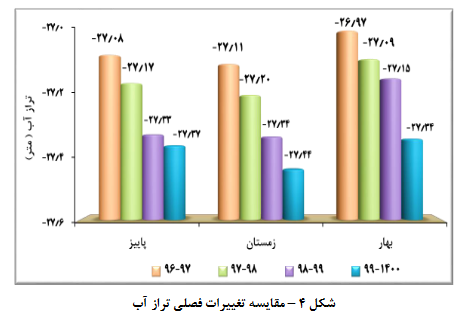 در فصل بهار ۱۴۰۰، تراز آب با کاهش قابل ملاحظه‌ ۱۹ سانتی‌متری نسبت به مدت مشابه سال گذشته به ۲۷.۳۴  متر رسیده است. کمترین تراز آب لحظه‌ای این فصل در نیمه اول فروردین‌ماه و بالاترین تراز آب لحظه‌ای در نیمه اول خردادماه و به ترتیب برابر منفی ۲۷.۶۵  متر و منفی ۲۶.۹۸  متر مشاهده شده‌اند، دامنه نوسانی این فصل نیز ۱۵ سانتی‌متر بوده است.