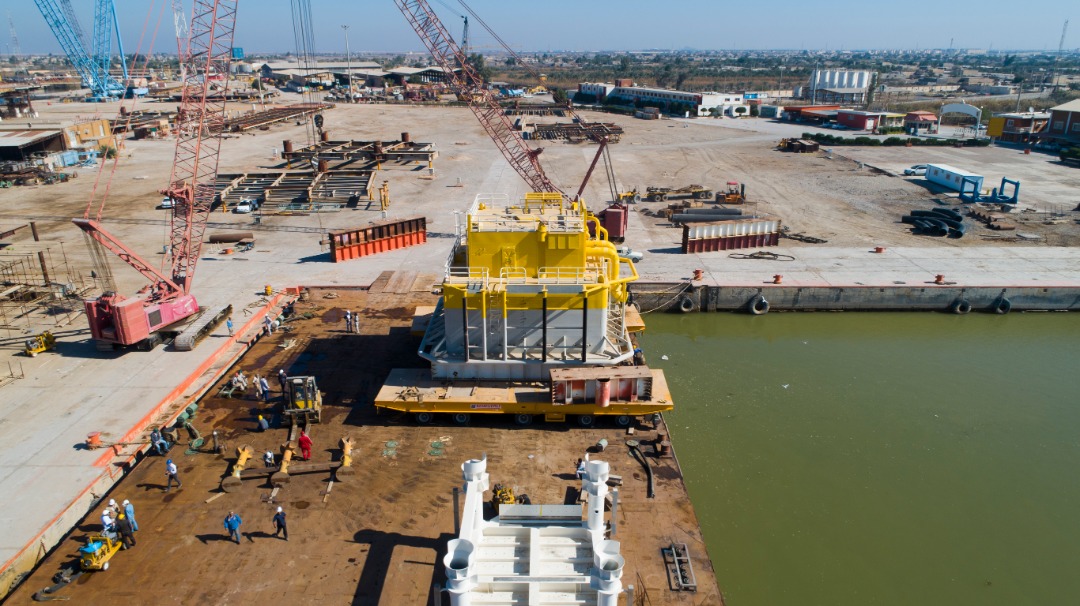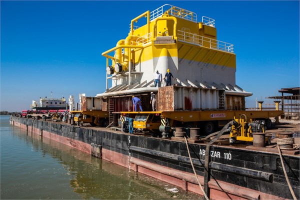 گوی شناور، چندراهه زیردریایی و متعلقات بخش زودهنگام طرح پایانه نفتی جاسک در یارد صنعتی خرمشهر بارگیری شد./شرکت نفت و گاز پارس