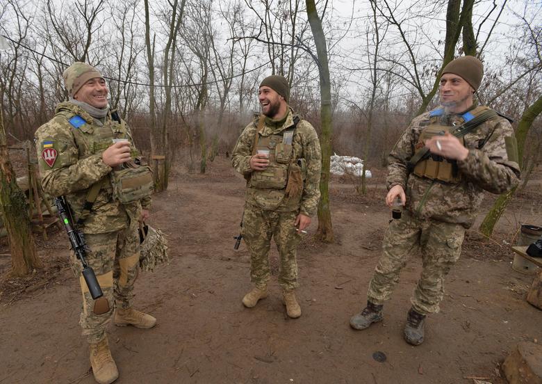 Ukrainian service members chat on the front line near the village of Travneve in Donetsk region, Ukraine December 15, 2021. REUTERS/Gleb Garanich