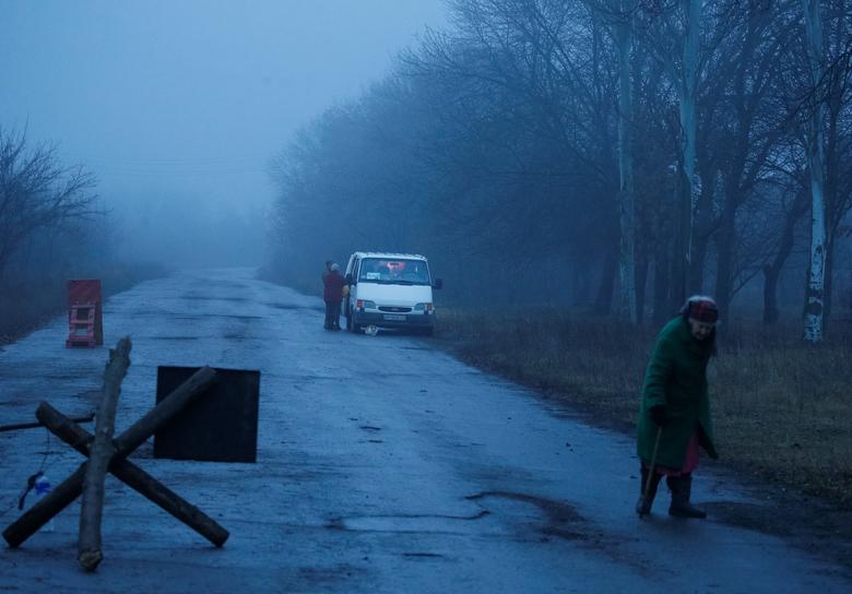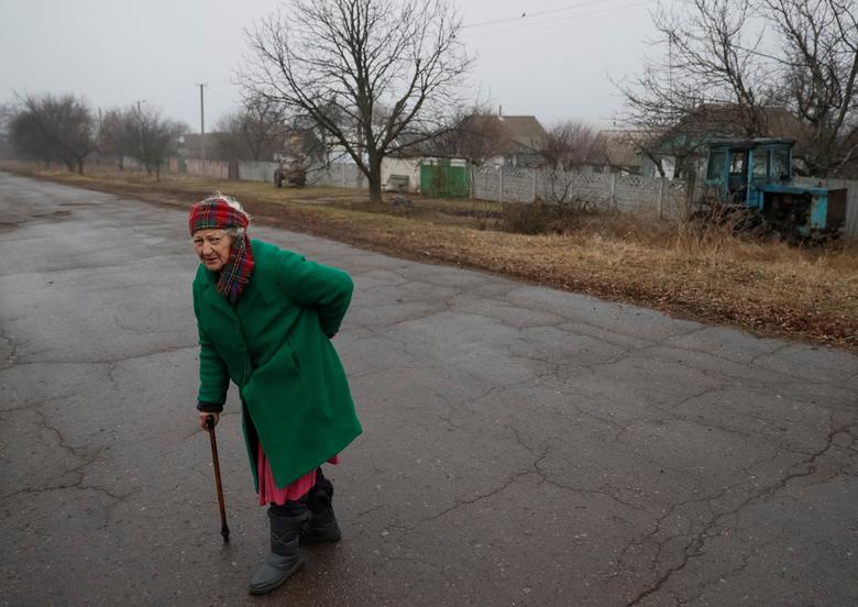 A local resident crosses a street near the front line in the village of Travneve in Donetsk region, Ukraine, December 15, 2021. Picture taken December 15, 2021. REUTERS/Gleb Garanich
