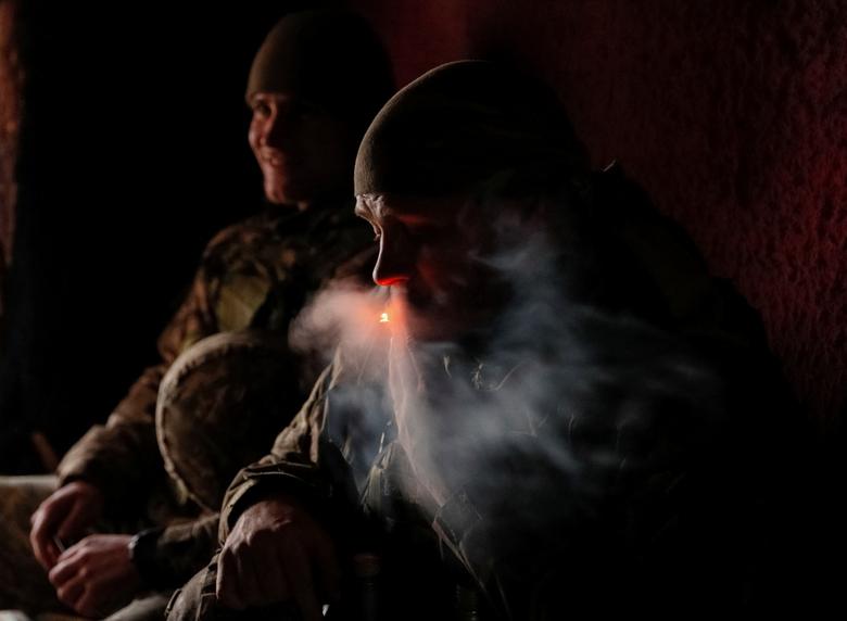 Ukrainian service members smoke in a trench on the front line near Travneve in Donetsk region, Ukraine, December 15, 2021. REUTERS/Gleb Garanich