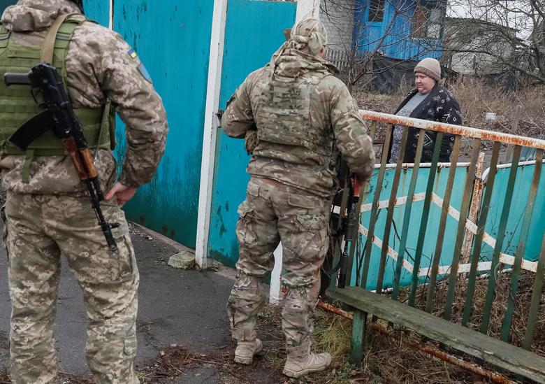 Ukrainian servicemen speak with a local resident near the front line in Travneve in Donetsk region, Ukraine, December 15, 2021. REUTERS/Gleb Garanich