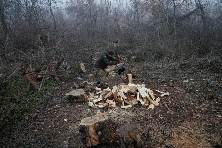 A Ukrainian service member prepares wood on the front line near Travneve in Donetsk region, Ukraine, December 15, 2021. REUTERS/Gleb Garanich