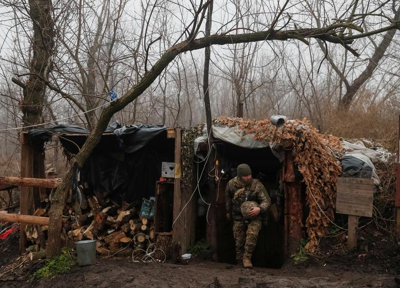 A Ukrainian service member leaves a recessed shelter on the front line near the village of Travneve in Donetsk region, Ukraine, December 15, 2021. Picture taken December 15, 2021. REUTERS/Gleb Garanich