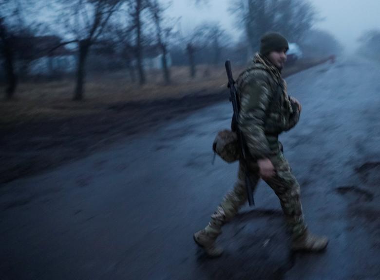 A Ukrainian serviceman crosses a street during a shelling near the front line in the village of Travneve in Donetsk region, Ukraine, December 15, 2021. Picture taken December 15, 2021. REUTERS/Gleb Garanich