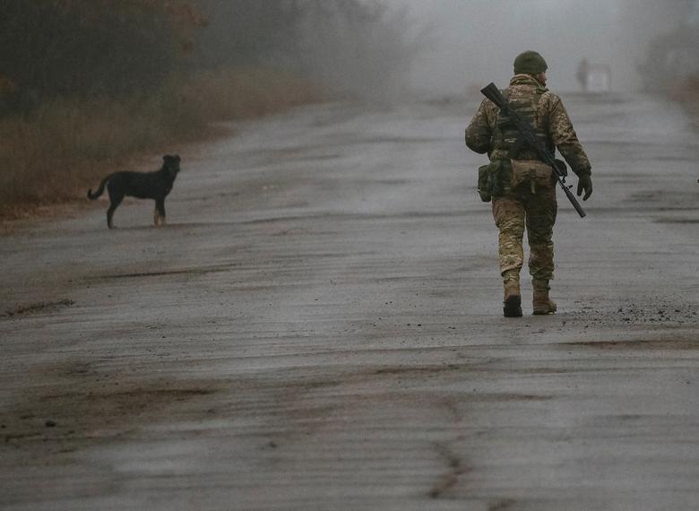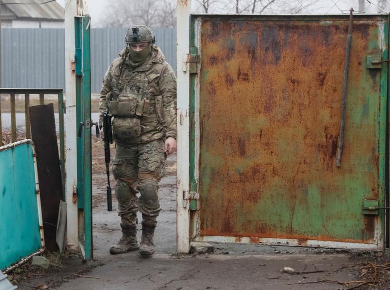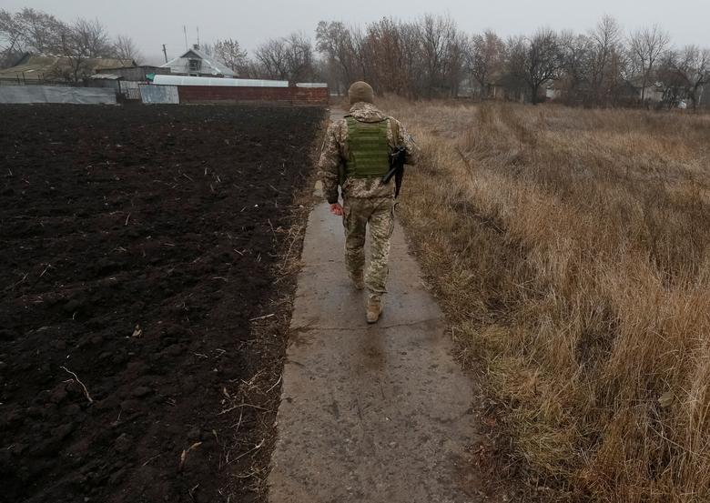 A Ukrainian serviceman walks along a street near the front line in the village of Travneve in Donetsk region, Ukraine, December 15, 2021. Picture taken December 15, 2021. REUTERS/Gleb Garanich
