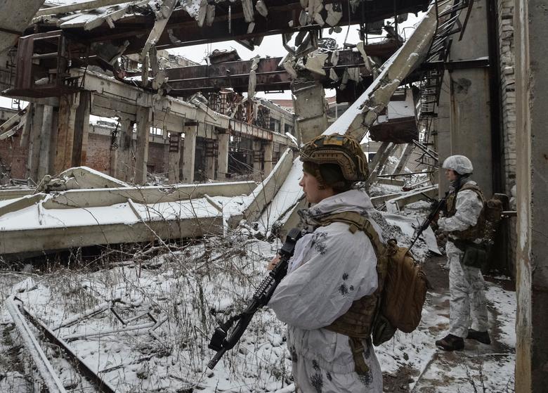 Ukrainian service members walk on the front line at the industrial zone of government-held town of Avdiyivka in Donetsk region, Ukraine December 17, 2021. REUTERS/Oleksandr Klymenko
