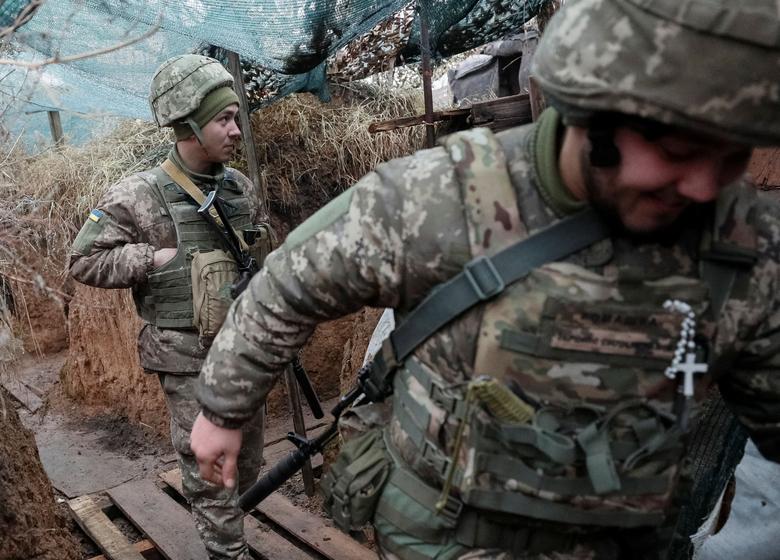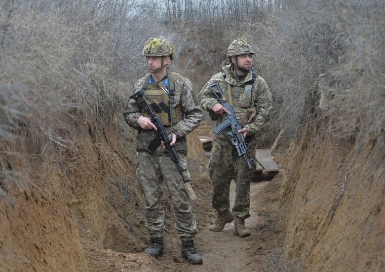 Ukrainian service members walk along a trench on the front line near Travneve in Donetsk region, Ukraine, December 15, 2021. REUTERS/Gleb Garanich
