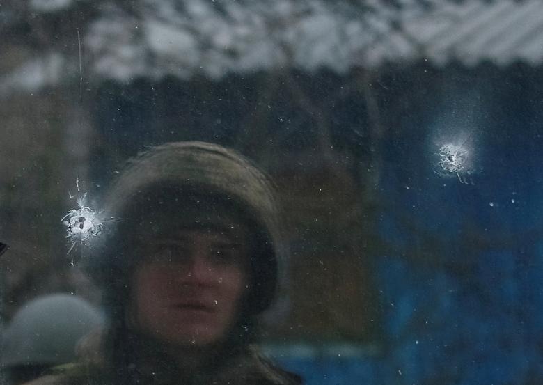 A Ukrainian service member looks at impacts of bullets in a window of the house of a local resident near the front line in the village of Travneve in Donetsk region, Ukraine, December 15, 2021. Picture taken December 15, 2021. REUTERS/Gleb Garanich …more