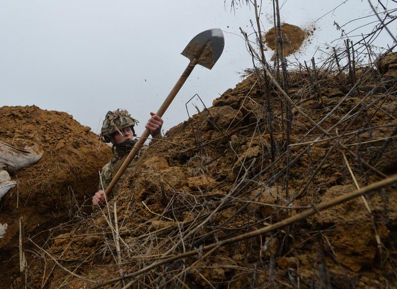 A Ukrainian service member digs a trench at a position on the front line near the town of New York (Novhorodske) in Donetsk region, Ukraine December 17, 2021. REUTERS/Oleksandr Klymenko