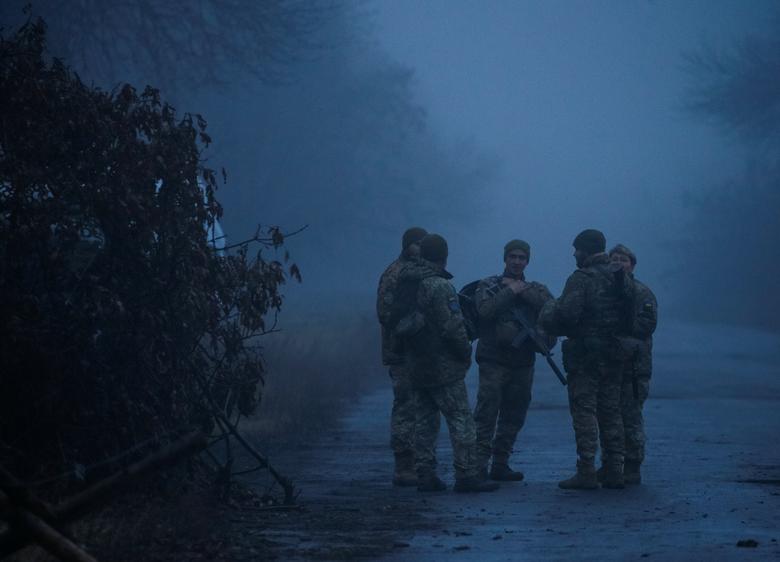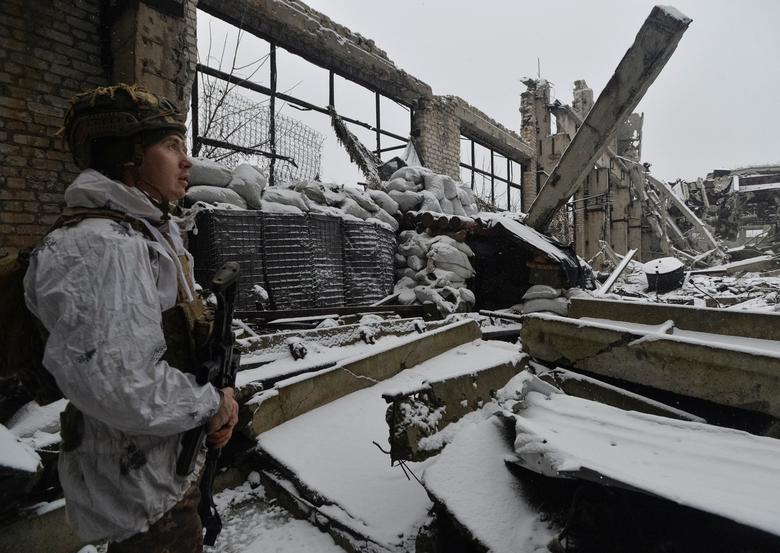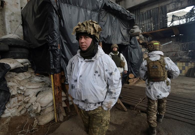 Ukrainian service members guard an area on the front line at the industrial zone of government-held town of Avdiyivka in Donetsk region, Ukraine December 17, 2021. REUTERS/Oleksandr Klymenko