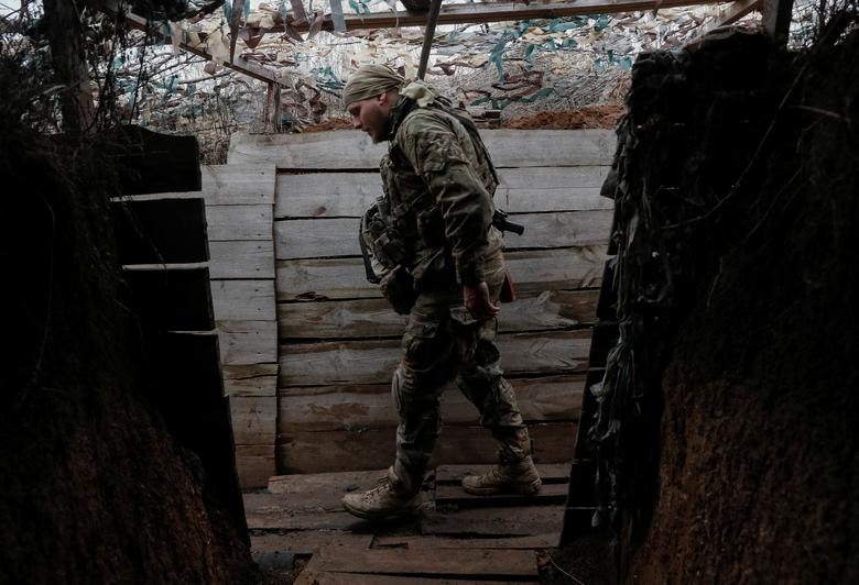 A Ukrainian service member walks along a trench on the front line near Travneve in Donetsk region, Ukraine, December 15, 2021. REUTERS/Gleb Garanich