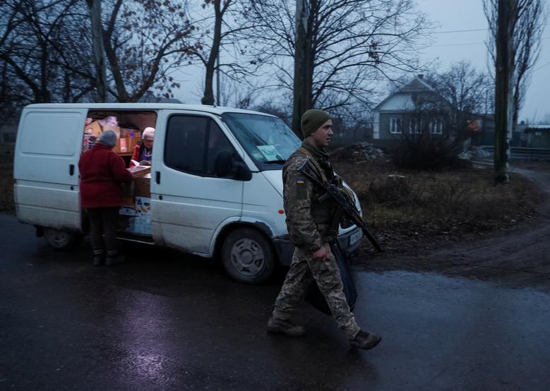 A Ukrainian service member and a local resident do the shopping in an auto shop as a woman walks along a street near the front line in Travneve in Donetsk region, Ukraine, December 15, 2021. REUTERS/Gleb Garanich