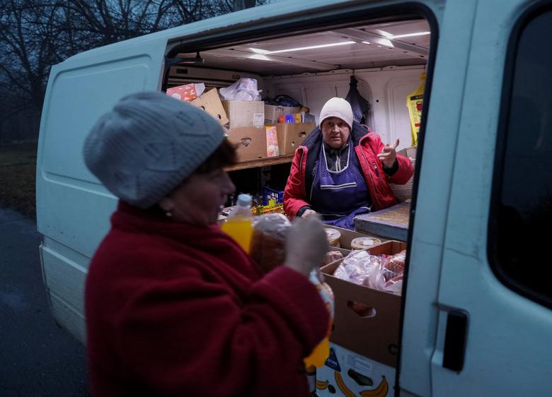 A local resident buys food and drink in an auto shop near the front line in the village of Travneve, in Donetsk region, Ukraine, December 15, 2021. Picture taken December 15, 2021. REUTERS/Gleb Garanich