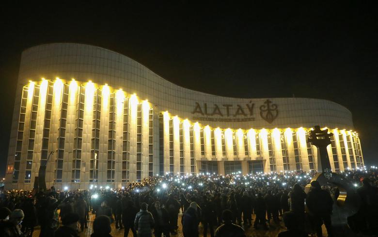 People use flashlights during a protest against LPG cost rise following the Kazakh authorities’ decision to lift price caps on liquefied petroleum gas in Almaty, Kazakhstan January 4, 2022. REUTERS/Pavel Mikheyev