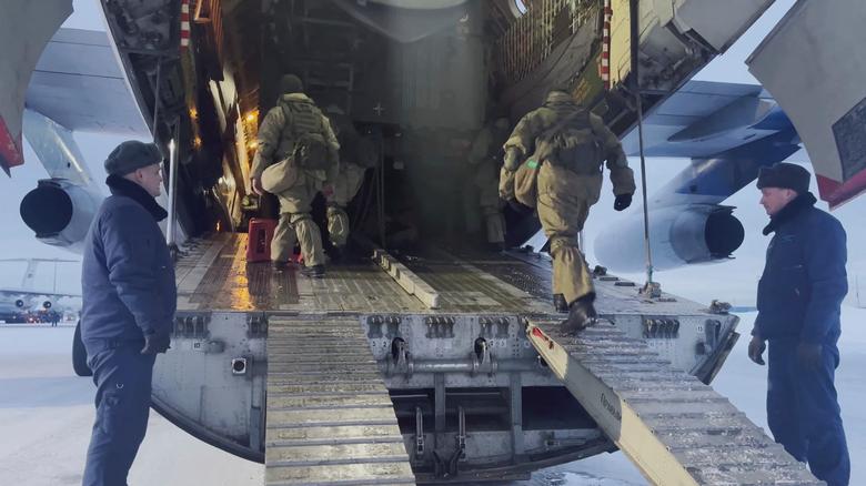 Russian servicemen board a military aircraft heading to Kazakhstan, at an airfield outside Moscow, Russia January 6, 2022, in this still image taken from video. Collective Security Treaty Organisation/Handout via REUTERS