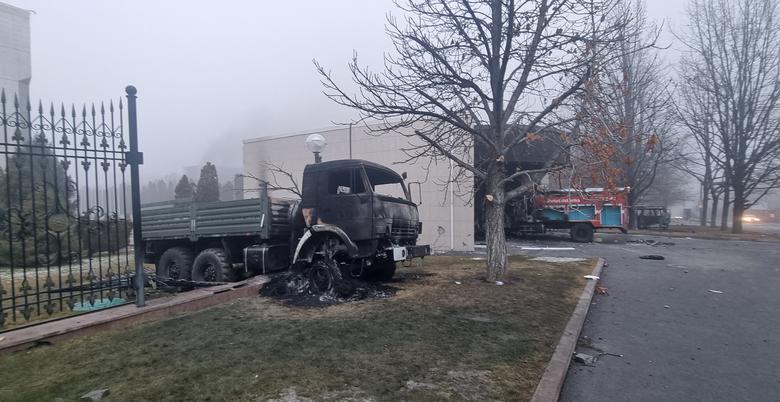 A truck that was burned during the protests triggered by fuel price increase is seen in front of the Presidential Residence in Almaty, Kazakhstan January 6, 2022. REUTERS/Pavel Mikheyev
