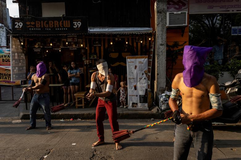 Customers at a coffee shop watch as Filipino Catholic devotees perform self-flagellation along a street on Maundy Thursday in Manila, Philippines, April 6. REUTERS