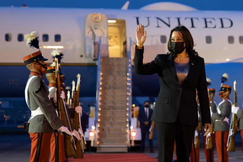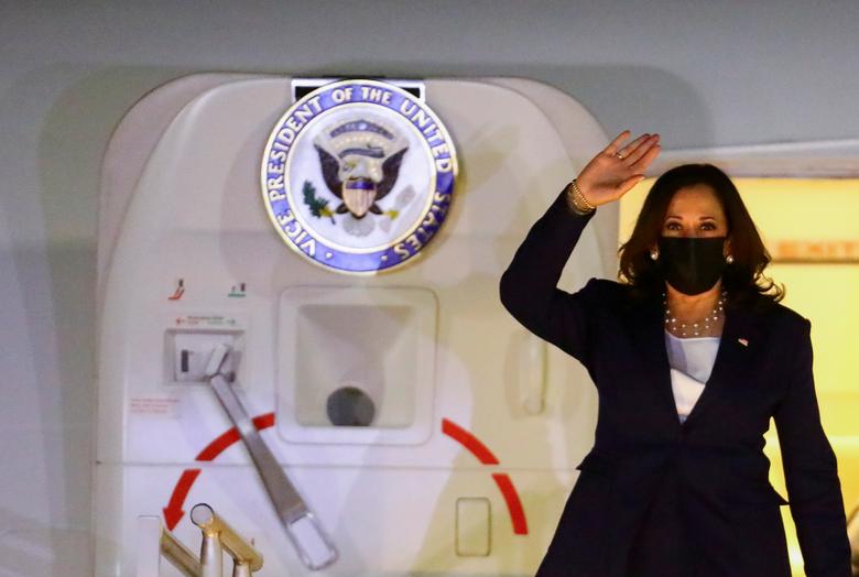 U.S. Vice President Kamala Harris waves as she arrives at Guatemalan Air Force Central Command in Guatemala City, Guatemala, June 6, 2021. REUTERS/Carlos Barria