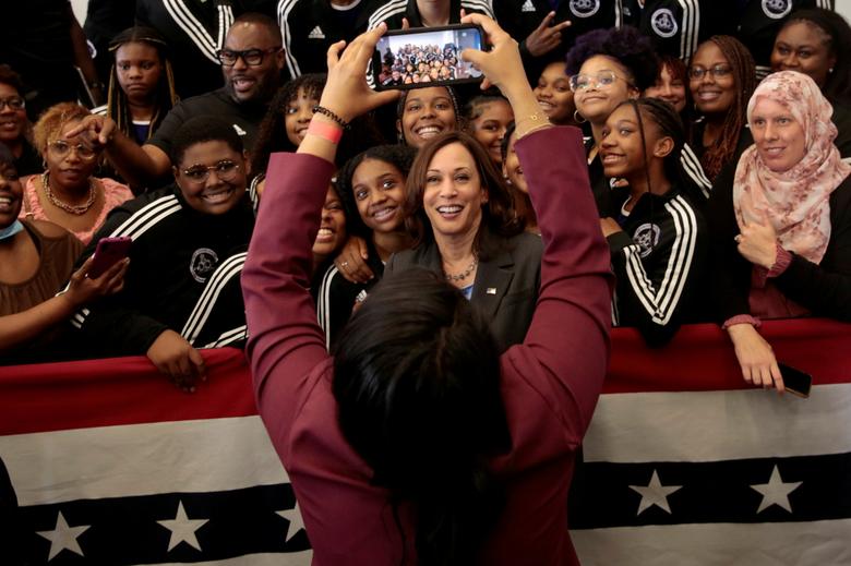 U.S. Vice President Kamala Harris points to an audience member in Greensboro, North Carolina, April 19, 2021. REUTERS/Tom Brenner