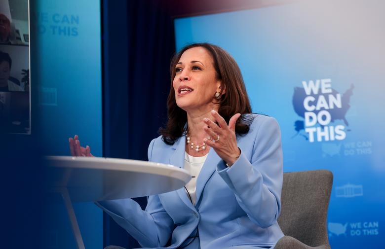 U.S. Vice President Kamala Harris addresses partners engaged in public health efforts to encourage more people to get COVID-19 vaccinations, in Washington, June 24, 2021. REUTERS/Evelyn Hockstein