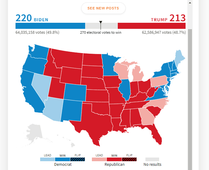 بایدن با پیروزی در ایالت ایلینویز تعداد آرای الکتورال را به 220 رای افزایش داد و از ترامپ با 213 رای پیش افتاد. برتری بایدن در ایالتهای مین، نوادا و آریزونا کماکان ادامه دارد. در طرف دیگر این رقابت ترامپ در ایالتهای جورجیا، کارولینای شمالی، پنسیلوانیا، میشیگان و ویسکانسین پیشتاز است.