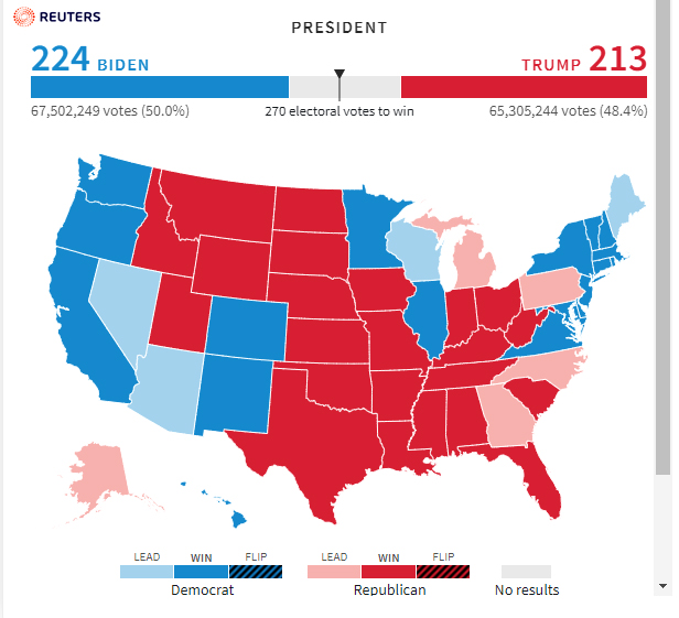 45 دقیقه از شروع پنجشنبه به وقت تهران گذشته بود که خبرگزاری رویترز پیروزی بایدن در ایالت میشیگان را نیز تایید کرد اما هنوز برنده شدن بایدن در ویسکانسین مورد تایید این خبرگزاری قرار نگرفته است. در حال حاضر براساس گزارش رویترز، جو بایدن دارای 243 رای الکتورال است اما فاکسنیوز 248، سیانان 253 و آسوشیتدپرس 248 رای الکتورال را برای بایدن تایید کردهاند. در حال حاضر جو بایدن تنها نیاز به 22 رای الکتورال دیگر برای برنده شدن در انتخابات ریاست جمهوری آمریکا دارد. ترامپ کماکان صاحب 214 رای الکتورال است.