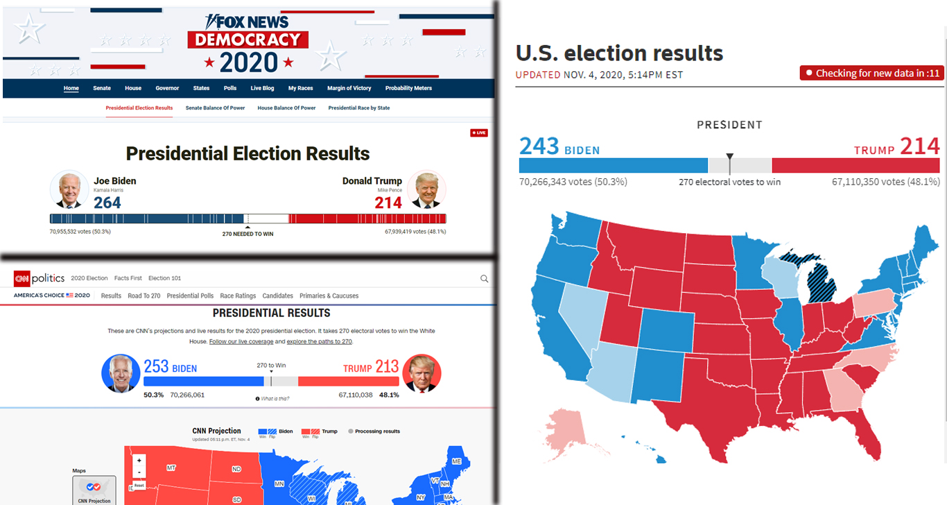 شبکه خبری فاکس نیوز در آخرین خبر خود تعداد آرای الکتورال جو بایدن را 264 رای اعلام کرد. شبکه خبری سیانان 253 رای و خبرگزاری رویترز نیز تعداد آرای الکتورال جو بایدن را 243 رای اعلام کرد.