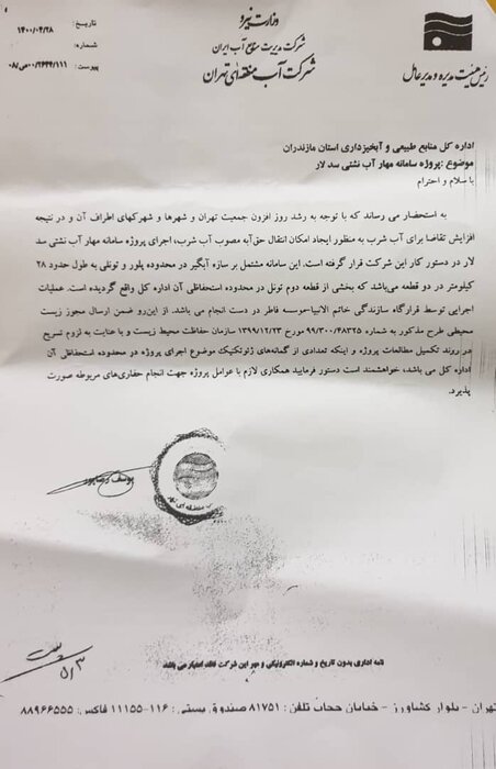 در نامهای که شرکت آب منطقهای تهران روز ۲۸ تیر به اداره کل منابع طبیعی و آبخیزداری مازندران نوشته، آمده است:
