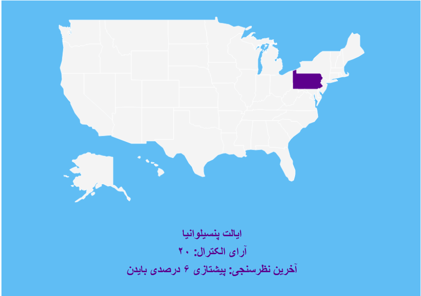 آخرین نظرسنجی انجام شده در پنسیلوانیا نشان می دهد که جو بایدن با اختلاف حدودا شش درصدی از دونالد ترامپ پیش افتاده است. نامزدی که بیشترین آراء را در این ایالت به دست آورد ۲۰ رای الکترال کسب خواهد کرد.