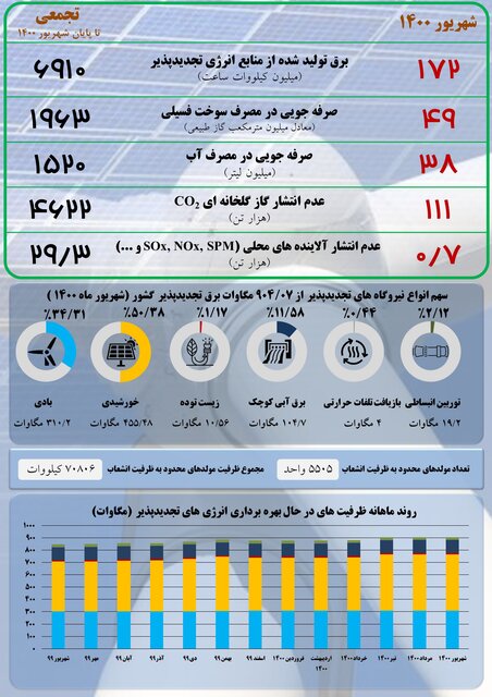 مجموع ظرفیت انرژی خورشیدی کشور تا پایان شهریورماه با تولید ۴۵۵.۴۸ مگاوات به ۵۰.۳۸ درصد رسیده و مجموع ظرفیت انرژی بادی کشور با تولید ۳۱۰.۲ مگاوات بالغ بر ۳۴.۳۱ درصد است. همچنین در این بین زیست توده با تولید ۱۰.۵۶ مگاوات تنها ۱.۱۷ درصد، برق آبی کوچک با تولید ۱۰۴.۷ مگاوات ۱۱.۵۹ درصد و بازیافت تلفات حرارتی با تولید ۴ مگاوات ۰.۴۴ درصد سهم دارد.