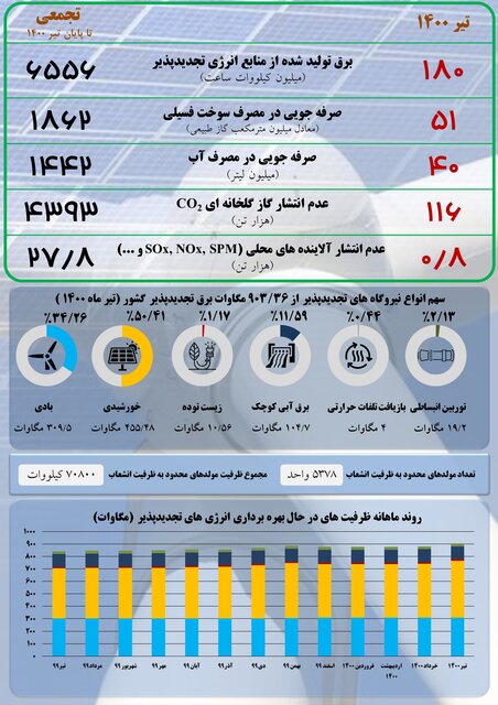 در این میان بر اساس آخرین آمار اعلام شده از سوی سازمان انرژی های تجدیدپذیر، آخرین وضعیت توسعه این انرژی در کشور حاکی از آن است که در تیرماه سال جاری با تولید حدود ۱۸۰ میلیونکیلوواتساعت انرژی تجدیدپذیر در کشور از انتشار ۱۱۶ هزار تن گاز گلخانهای و همچنین ۸۰۰ تن آلایندههای محلی تا پایان این ماه جلوگیری شده است.