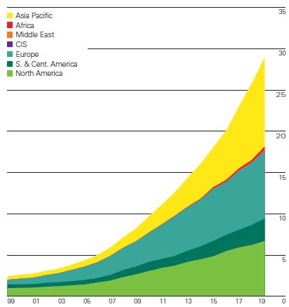 اینفوگرافیک:مصرف انرژی تجدید پذیر (از جمله سوخت های زیستی به جز هیدروژنه) با 12.1 درصد رشد ، پایین تر از میانگین تاریخی آن است ، اگرچه افزایش از نظر انرژی (3.2 EJ) بود بالاترین رکورد و بیشترین میزان سوخت در سال 2019 است. براساس این گزارش، کشور چین بزرگترین سهم در رشد تجدیدپذیر (0.8 EJ) و پس از آن ایالات متحده (0.3 EJ) و ژاپن (0.2 EJ) هستند.