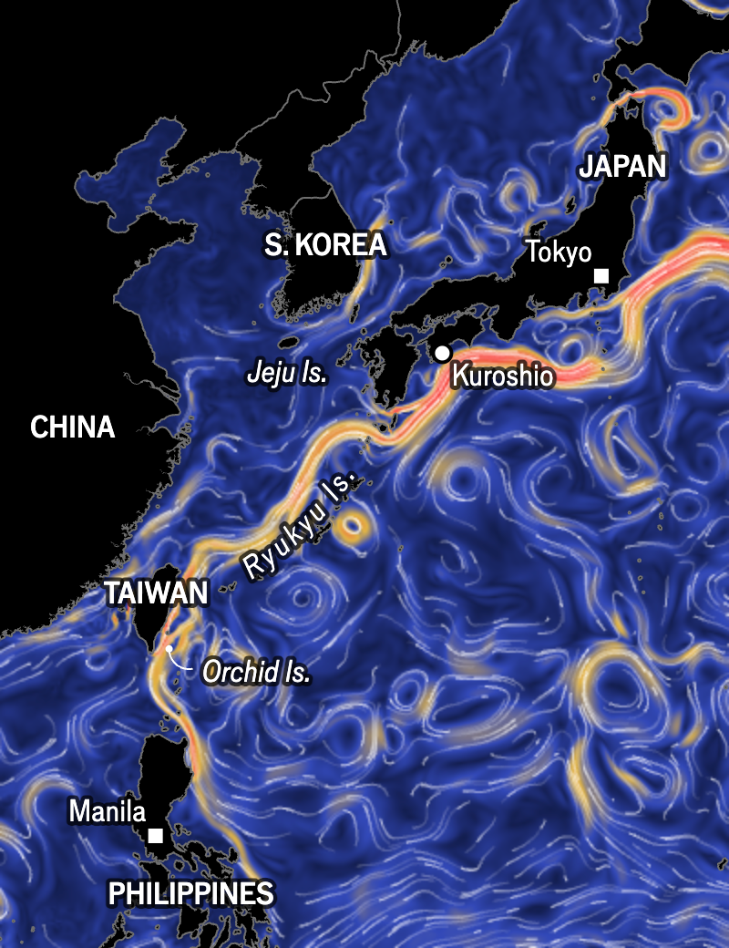 جریان سیاه یا نهر سیاه با جریان بین فیلیپین و تایوان قدرت میگیرد. نیروهای آمریکایی در طول جنگ جهانی دوم دهها کشتی ژاپنی را در آنجا غرق کردند. این جریان اجساد سربازان را به سواحل تایوان میآورد.
