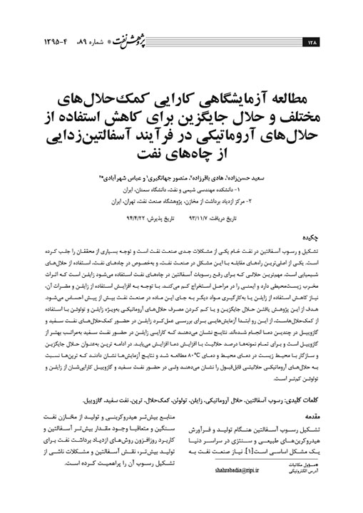 مطالعه آزمایشگاهی کارایی کمک حلالهای مختلف و حلال جایگزین برای کاهش استفاده از حلالهای آروماتیکی در فرآیند آسفالتین زدایی از چاههای نفت