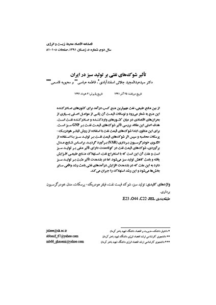 از بین منابع طبیعی، نفت مهمترین منبع کسب درآمد برای کشورهای صادرکننده این منبع به شمار میرود و نوسانات قیمت آن یکی از عوامل اصلی بسیاری از بحران های اقتصادی در میان کشورهای واردکننده و صادرکننده نفت است. هدف اصلی این مقاله، بررسی تأثیر شوک های قیمت نفت بر GNP سبز است. برای این منظور، ابتدا شوکهای قیمت نفت با استفاده از روش فیلتر هودریک- پرسکات محاسبه و سپس اثر شوکهای قیمت نفت بر تولید سبز با استفاده از الگوی خودرگرسیون برداری (VAR) برآورد گردید.