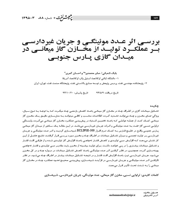 در این مقاله یک سکتور از میدان گاز میعانی پارس جنوبی واقع در خلیج فارس به کمک نرم افزار ECLIPSE-300 شبیهسازی گردید و اثر عدد موئینگی و جریان غیردارسی بر تولید تجمعی و میزان تشکیل میعانات در اطراف چاه و مخزن مورد بررسی قرار گرفتند.