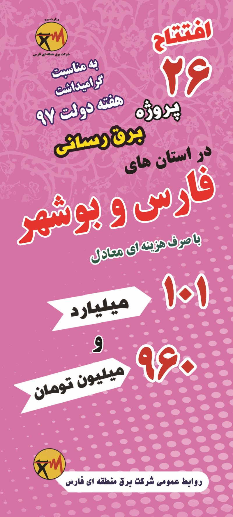 ازاین 26 پروژه 13 پروژه آن در استان فارس با اعتباری بالغ بر 62 میلیارد و 960 میلیون تومان و 13 پروژه شامل خطوط ، پست و افزایش ظرفیت پست نیز در استان بوشهر با اعتباری بالغ بر 39 میلیارد تومان احداث شده است . گفتنی است این پروژهها و پروژه های مشابه از جمله احداث خطوط و توسعه و افزایش ظرفیت ایستگاههای فوق توزیع در برق منطقه ای فارس ، با هدف تامین رفاه مردم استانهای فارس و بوشهر انجام شده است .